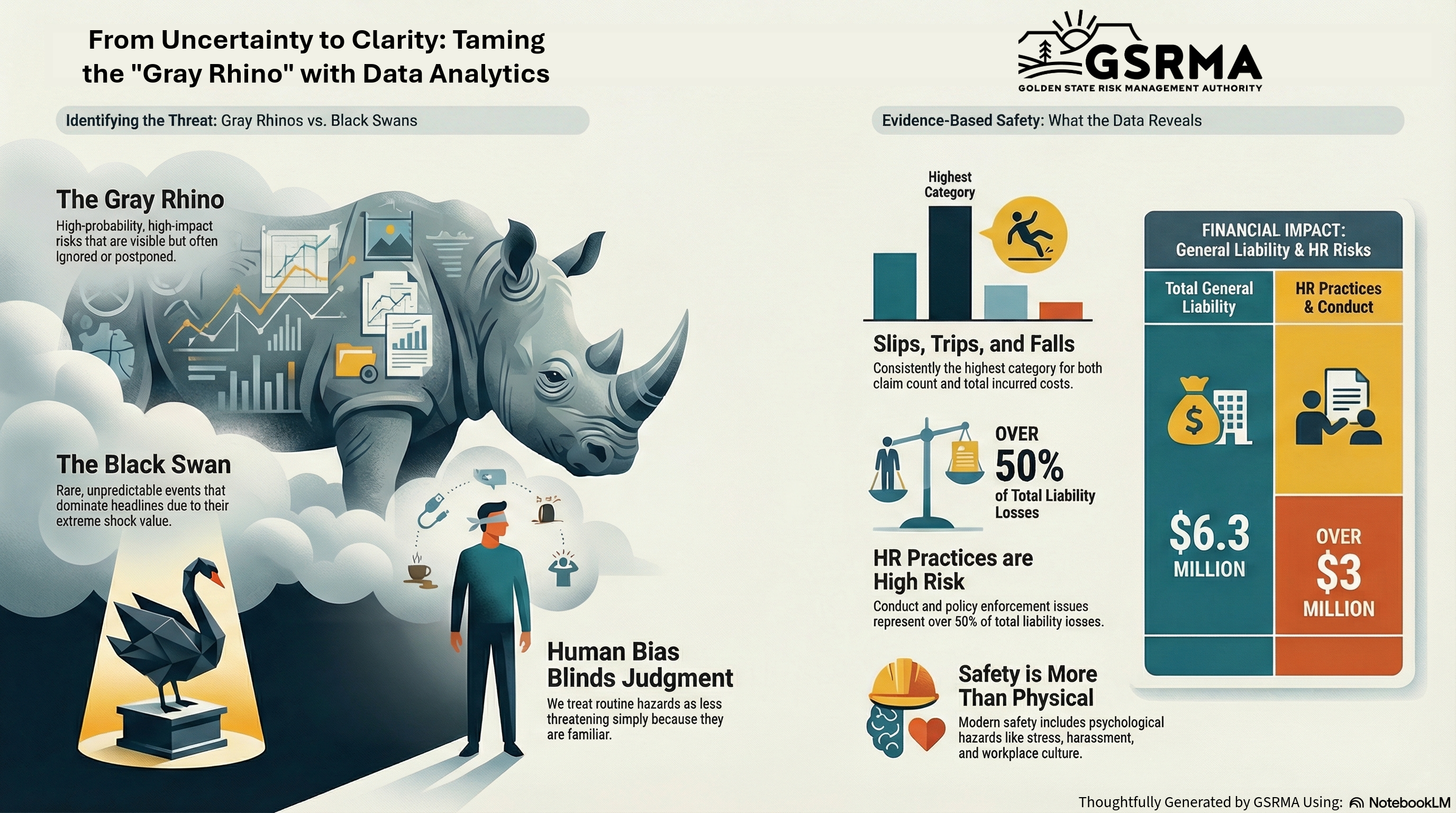 Data analytics helps organizations confront uncomfortable truths. It challenges assumptions about what is rare versus what is routine. It exposes where attention may be misaligned with actual loss experience. Without data, organizations may treat a gray rhino as if it were a black swan, reacting only after damage has occurred. With data, they can see which risks deserve proactive attention and sustained investment.